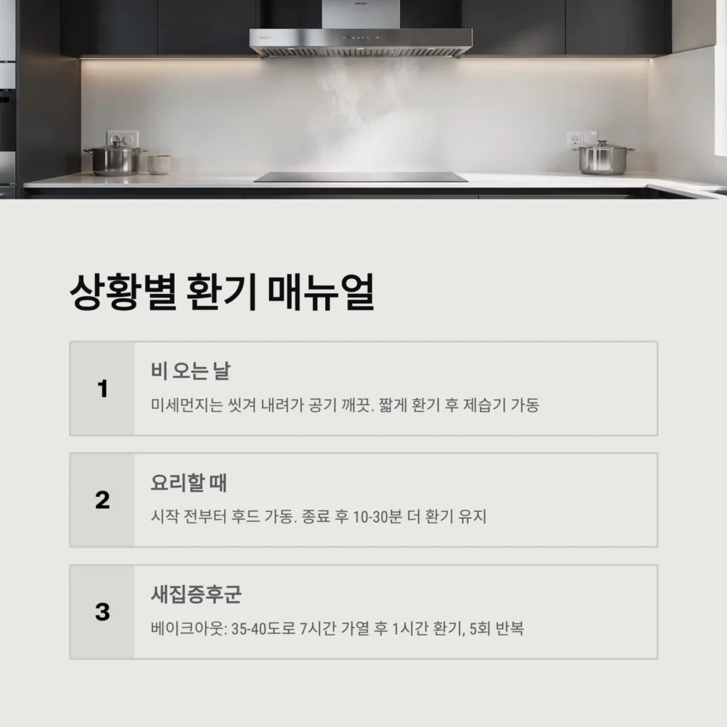 - 조리 중: 주방 창문을 조금이라도 열어둡니다. (후드만으로는 부족합니다.)